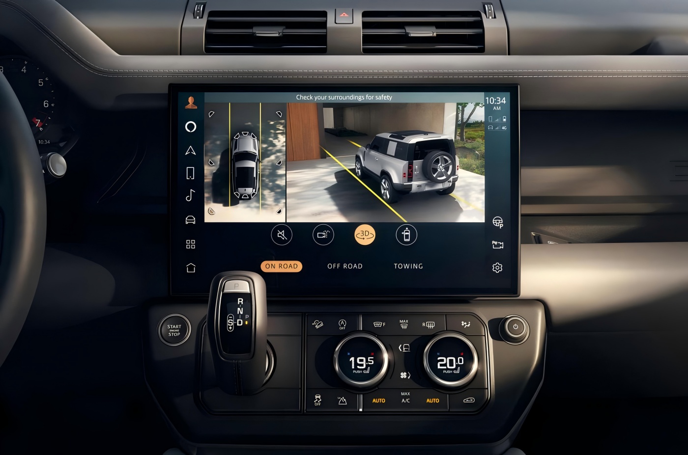 Notranjost. Glede na notranjost se celotna postavitev novega vozila ni veliko spremenila. Še vedno je na voljo s polno tekočo kristalno instrumentno ploščo in večfunkcionalnim volanom s tremi kraki. Zaslon za večpredstavnostno prikazovanje na sredini sredinske konzole je bil nadgrajen z 11,4 palca na 13,1 palca. Medtem je novo vozilo dodalo sistem za spremljanje voznikov. Ta sistem spremljanja je v skladu s predpisi EU GSR2. Če voznik odkrije, da ne bo pozoren na cesto, ki je pred nami, bo sprožila zvočne in video alarme. Vendar pa lahko pomoč voznika nastavite na onemogočeno v možnostih na zaslonu Center Console. Poleg tega se na Land Rover Defenderju prvič prvič ponuja tudi prilagodljivi terenski sistem za terenski tempomat kot neobvezno funkcijo.